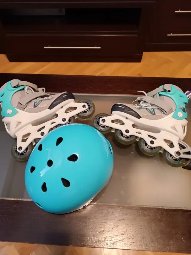 Conjunto de patines en línea y casco. - Patines Decathlon ajustables de la talla 32 a la 35. - Casco de protección con contorno de cabeza de 55 a 58 cm.
