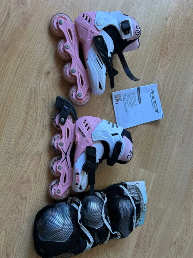 Detalles del productoPatines en línea de color rosa, talla 35-38, de la marca Decathlon. Incluyen protecciones.