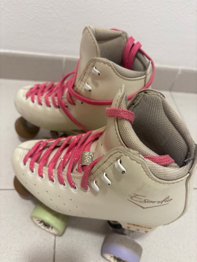 Se venden patines de patinaje artístico. - Cordones rosas con detalles brillantes. - Bota Esordio 230. - Ruedas Angel (verde y morado). - Plancha Queen Skate 120