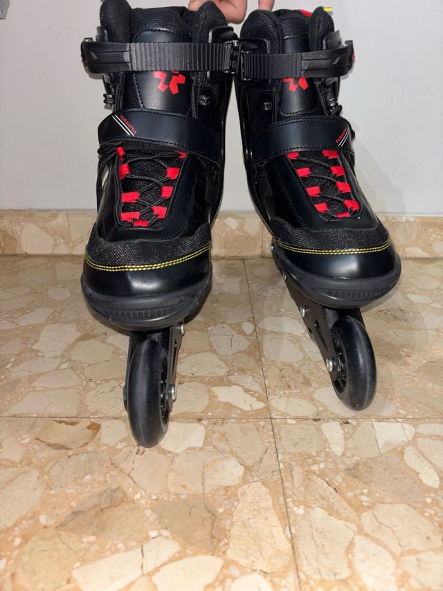 Patines en línea de color negro con detalles en rojo y amarillo. - Cierre de velcro y hebilla. - Cordones rojos. - Ruedas negras. - Talla 43-46