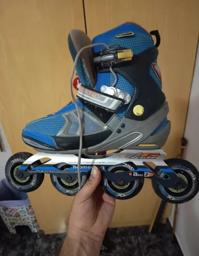 Detalles del productoPatines en línea de color azul y gris con cuatro ruedas. Cuentan con un sistema de cierre de cordones, velcro y hebilla,están en muy buen estado.