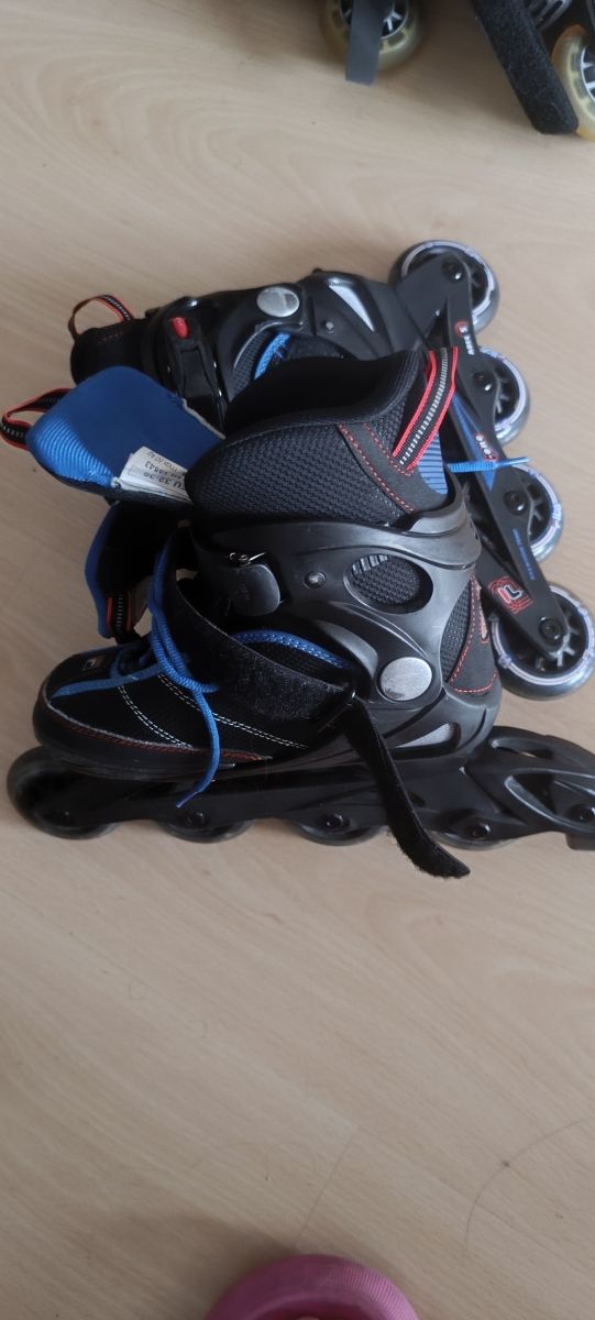 Patines en línea en buen estado, ajustables a la talla 32-36. - Color negro y azul. - Sistema de ajuste cómodo. - Ruedas en buen estado.