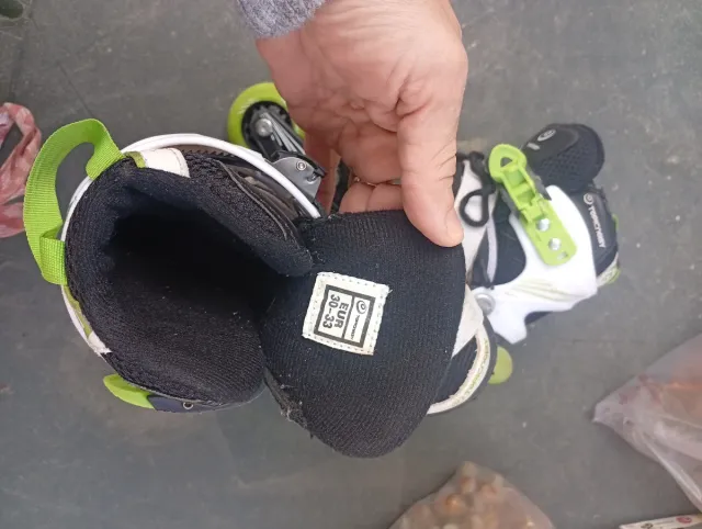 Patines en línea para niños, con ajuste de talla. - Talla EUR 30-33. - Cierre de hebilla y velcro. - Ruedas verdes.