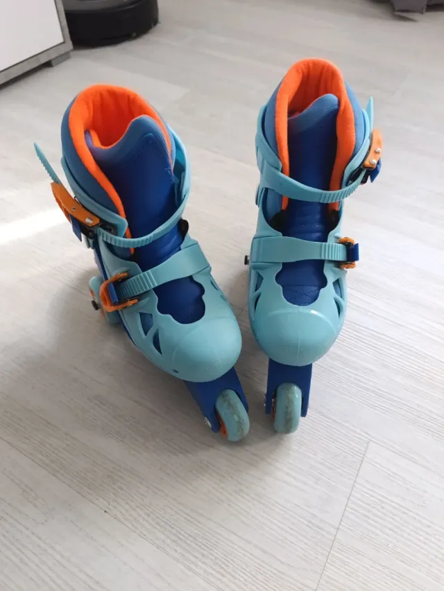 Detalles del productoPatines en línea de color azul claro y naranja, ideales para niños y niñas. Son ajustables para adaptarse al crecimiento.Se puede pones a tres ruedas o en líneas, a falta de un tornillo que le vale cualquiera de ferretería, Ajustable del número 29 al 32. Puesto tres veces contadas. Precio nuevo 35 euros.