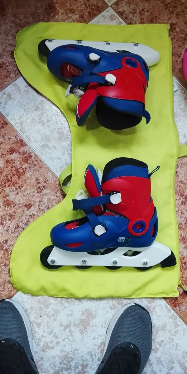 Detalles del productoSet de patines en línea para niños y niñas, con un diseño llamativo en azul y rojo. Incluyen una bolsa de transporte.