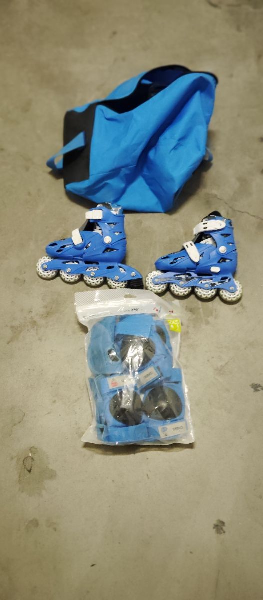 Detalles del productoSet de patines en línea de color azul, ideal para iniciarse en el patinaje. Incluye protecciones y una bolsa para transportarlo todo.