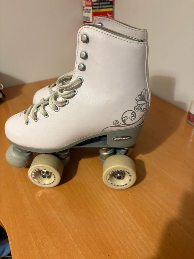 Patines en línea de color blanco con detalles florales. - Cordones blancos. - Ruedas de color crema con inscripción. - Marca BladeRunner. Talla 37