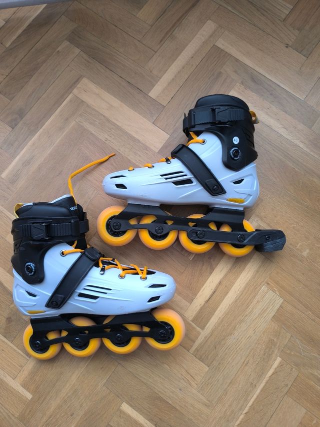 Se venden patines en línea en color blanco con detalles en negro y amarillo. - Talla 43 - Cierre de cordones y hebillas. - Poco uso