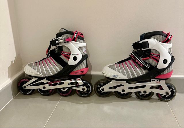 Se venden patines en línea Boomerang en color blanco, gris y rosa. TALLA 39-40 - Diseño deportivo. - Cierre de velcro y hebilla. - Ruedas de alto rendimiento.