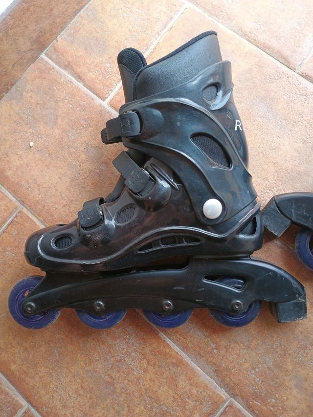 Patines en línea Rollerblade, usados pero en buen estado. - Son de color negro. - Tienen ruedas de color morado. - Incluyen dos patines.