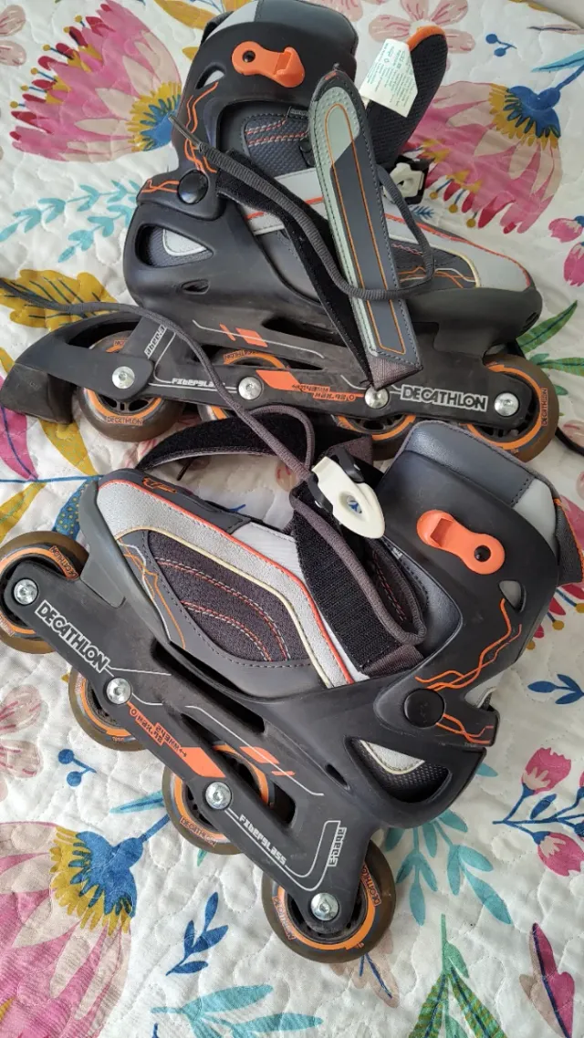 Detalles del productoPatines en línea de la marca Decathlon, de la talla 38, ideales para iniciarse en el patinaje. Están usados y en muy buen estado. Incluye protecciones para manos, codos y rodilla, todo metido en una bolsa para facolitar transporte, la volsa tiene una mancha.