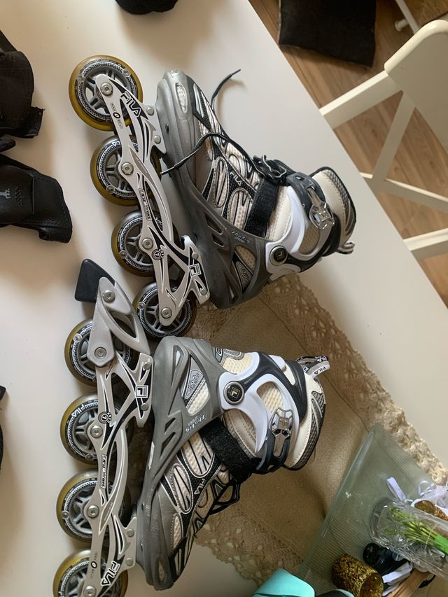 Patines en línea de la marca Fila. - Talla 39 - Diseño deportivo en color gris y blanco. - Cierre con cordones y velcro. - Ruedas de poliuretano.