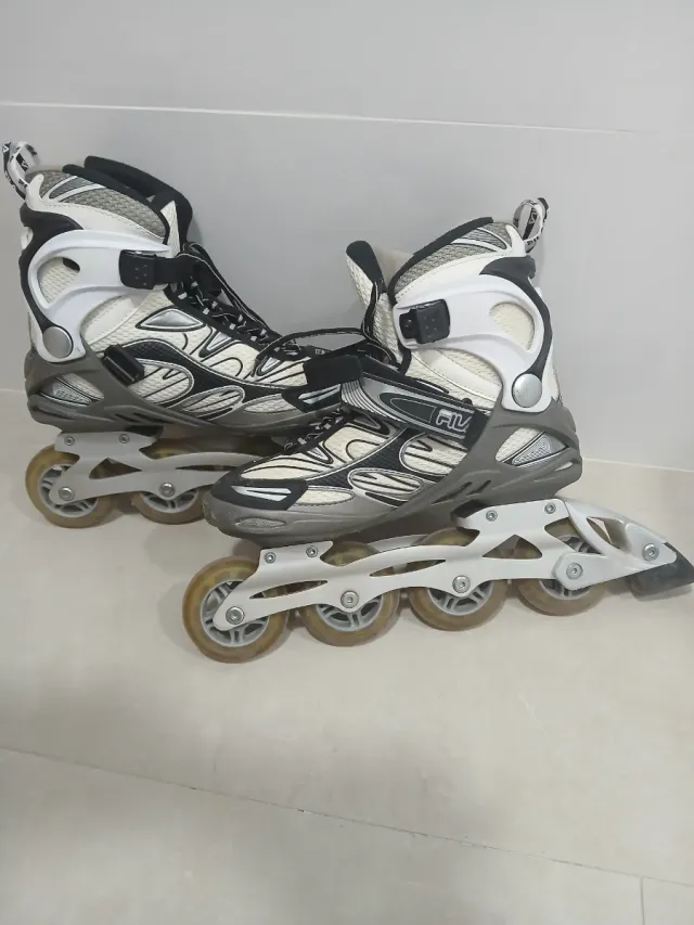 Detalles del productoPatines en línea de la marca Fila, con un diseño moderno en blanco y negro.