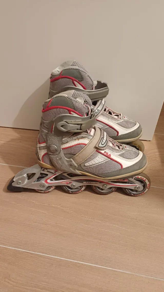 Detalles del productoSe venden patines en línea de la marca Fila en color gris con detalles en rojo. Talla 39.