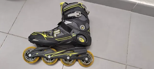Patines en línea de la marca Fila en color negro y detalles en amarillo. - Diseño deportivo. - Cierre de velcro y hebilla. - Ruedas amarillas.