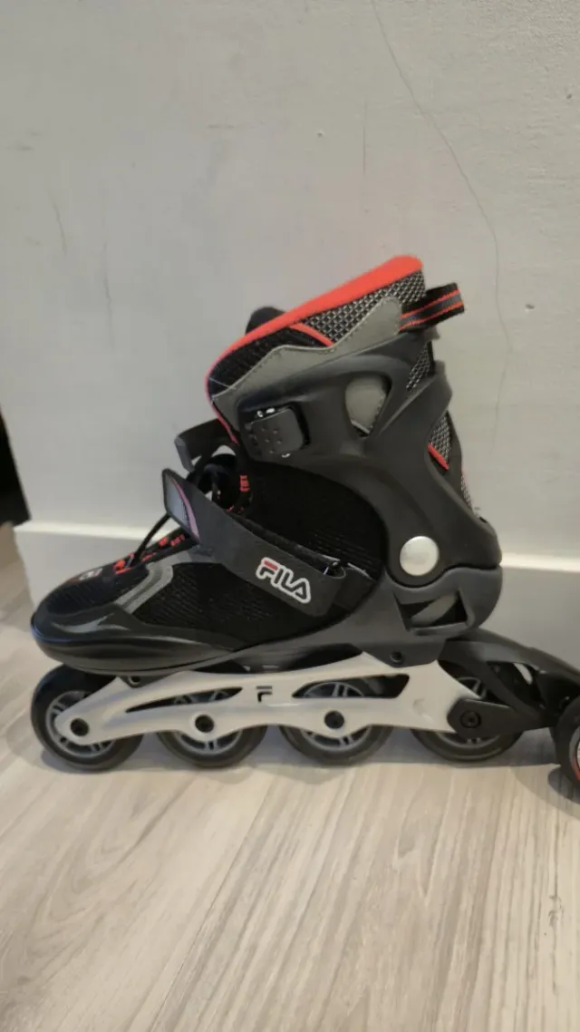 Detalles del productoPatines en línea de la marca Fila, con un diseño moderno en color negro y detalles en rojo.