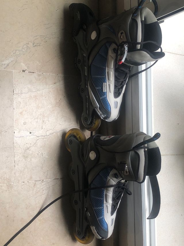 Par de patines en línea con un diseño moderno en gris y azul. Perfectos para desplazarse o practicar. - Ruedas amarillas. - Cierre de cordones y hebilla.