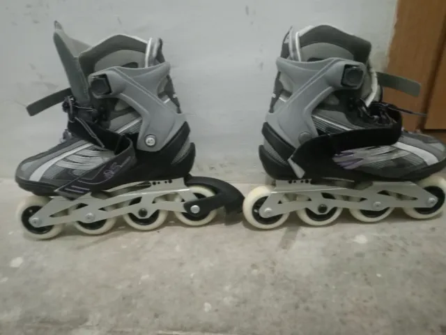 Detalles del productoPar de patines en línea con un diseño moderno en tonos grises y negros.
