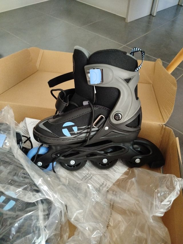 Patines en línea para niños. Nuevos. Ideales para principiantes. - Color negro y azul. - Talla ajustable. - Incluye dos patines.