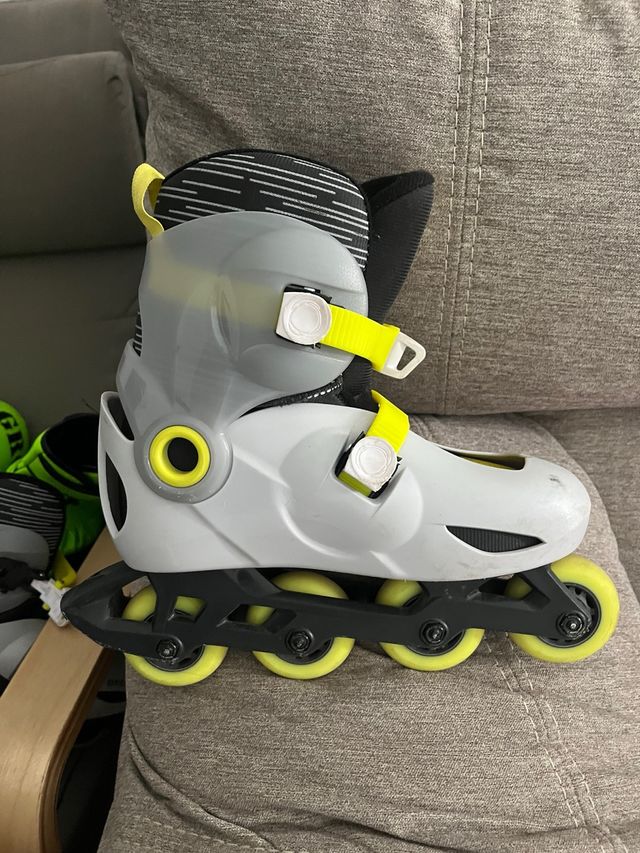 Patines en línea para niños, en buen estado. Ideales para principiantes. - Color gris y amarillo neón. - Sistema de cierre con hebillas. - 4 ruedas. - Casco
