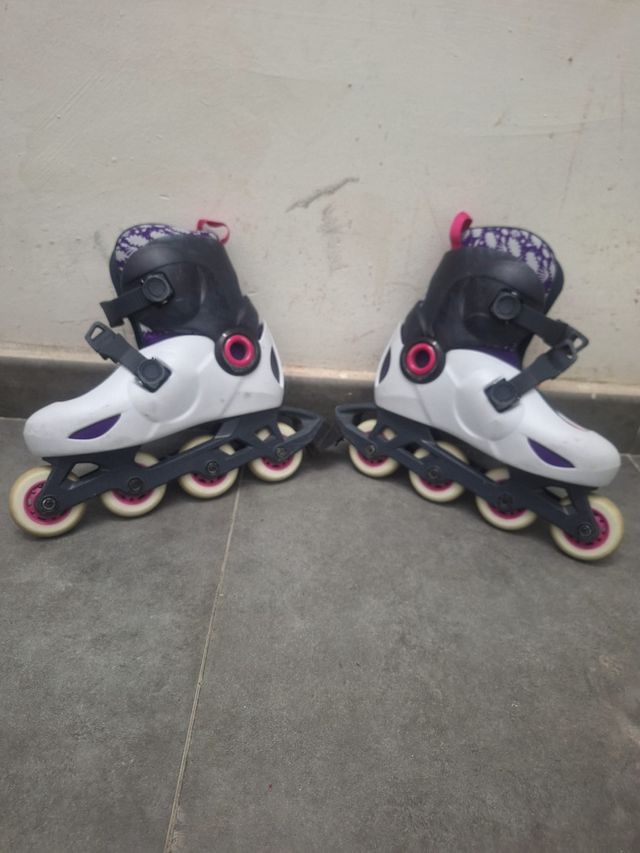 Patines en línea para niñas, en buen estado. Ideales para principiantes. - Talla: 32-34 - Color: Blanco y morado - Dos patines incluidos