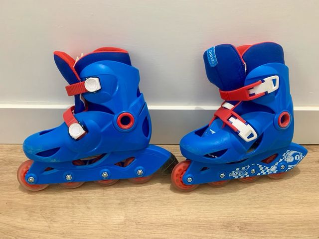 Detalles del productoSe venden patines en línea para niños, con un diseño llamativo en color azul y detalles en rojo.