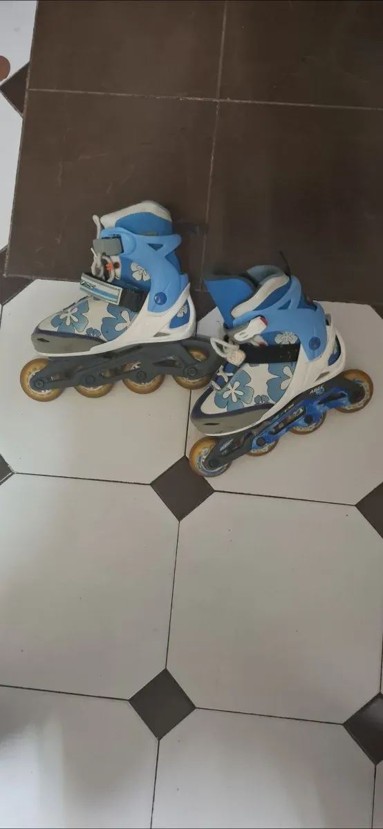 Detalles del productoSet de patines en línea para niños con un diseño floral en tonos azules y blancos. Son cómodos y seguros para iniciarse en el patinaje. Número 35/38