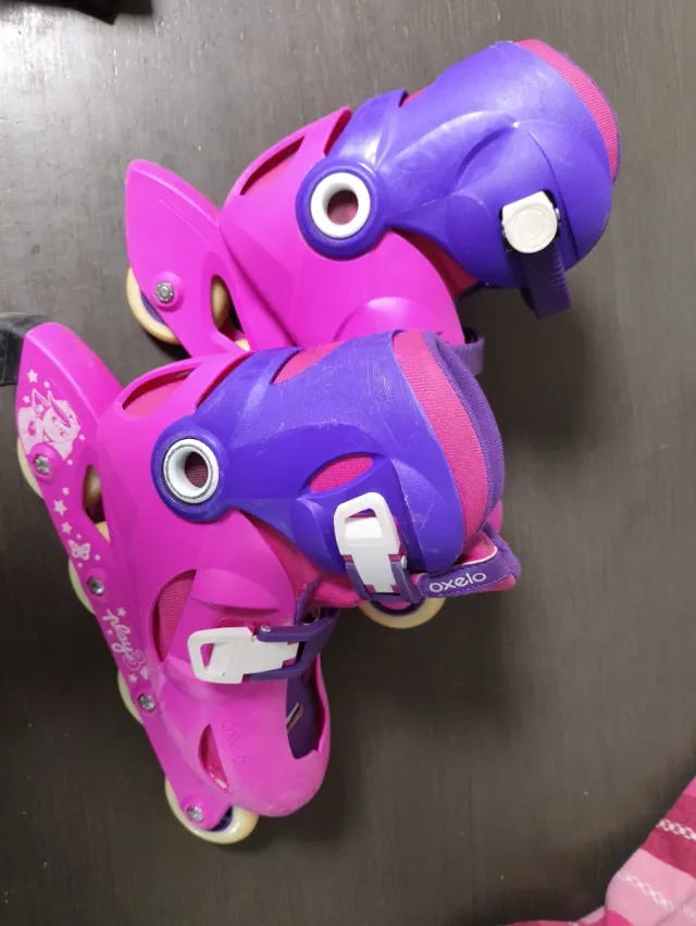 Detalles del productoPatines en línea de color rosa y morado, ideales para niños y niñas. Diseñados para iniciarse en el patinaje.