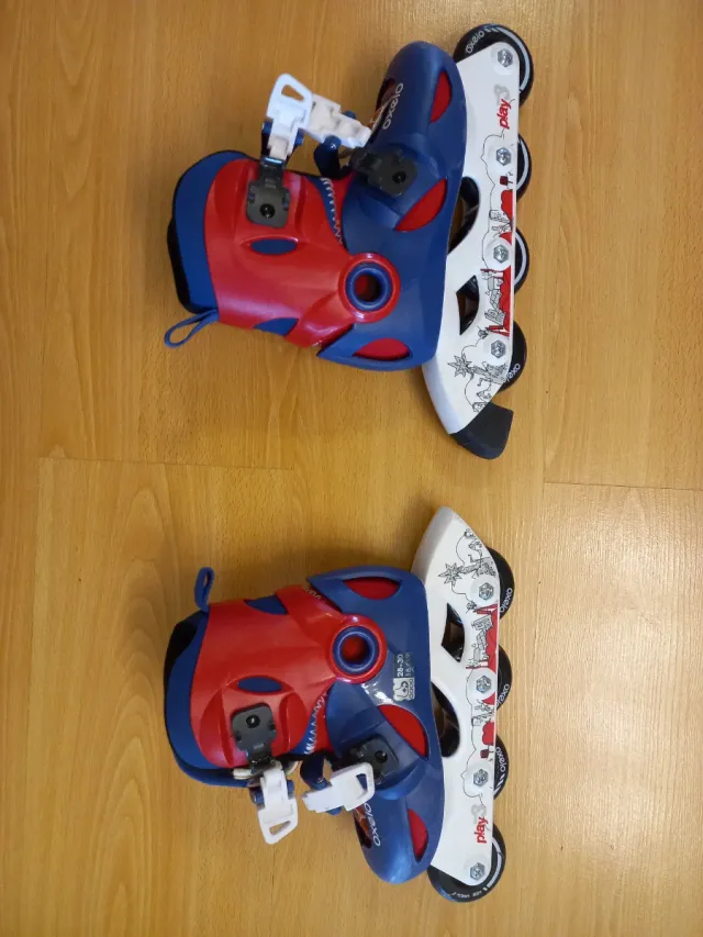 Detalles del productoPatines en línea de color azul y rojo, ideales para niños. Cuentan con un diseño ajustable para adaptarse al crecimiento: