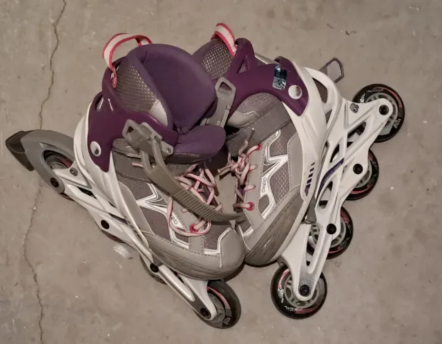 Patines en línea de color gris y morado, ideales para niñ@s. - Cierre con cordones y hebilla. - Ruedas de 80A. - Marca Oxelo.