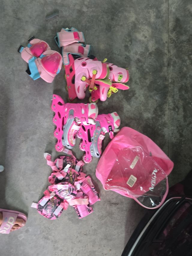 Detalles del productoPatines en línea infantiles, ideales para principiantes. Son de color rosa y parecen estar en buen estado.