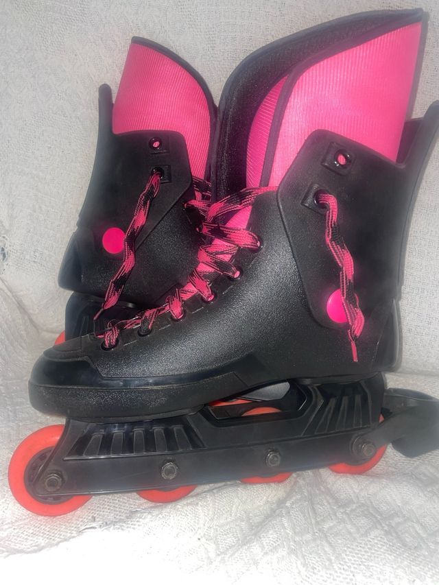 Detalles del productoPatines en línea infantiles, ideales para principiantes. Son de color negro con detalles en rosa.