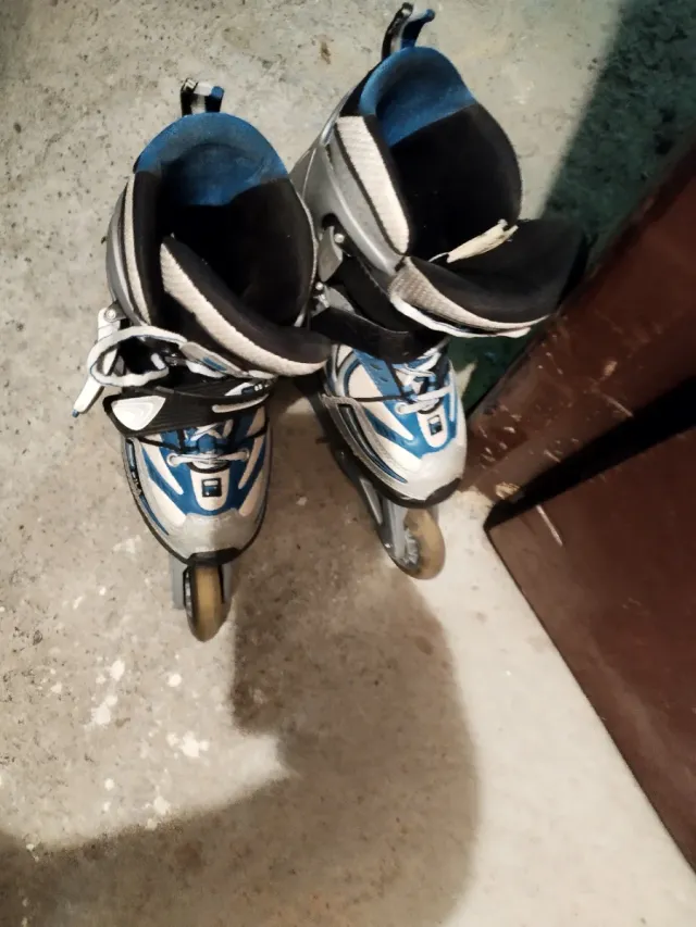 Patines en línea para niños, talla 32-35. Perfectos para iniciarse en el patinaje. - Diseño en blanco, azul y plateado. - Cierre con cordones y hebilla.