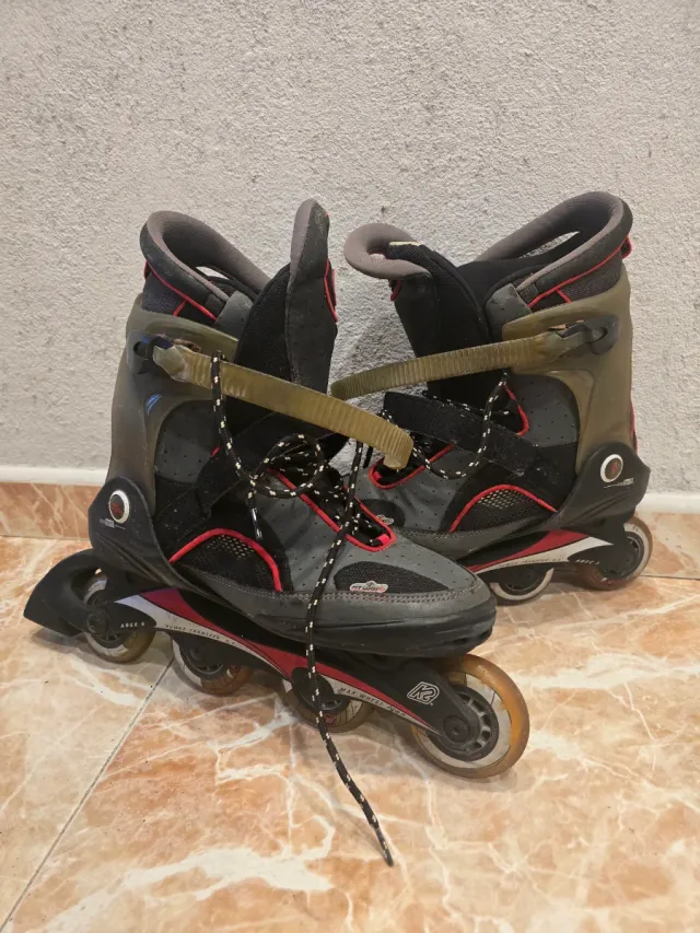 Se venden patines en línea K2 en color gris y negro con detalles en rojo. - Cierre de velcro y cordones. - Ruedas K2. - Diseño deportivo.