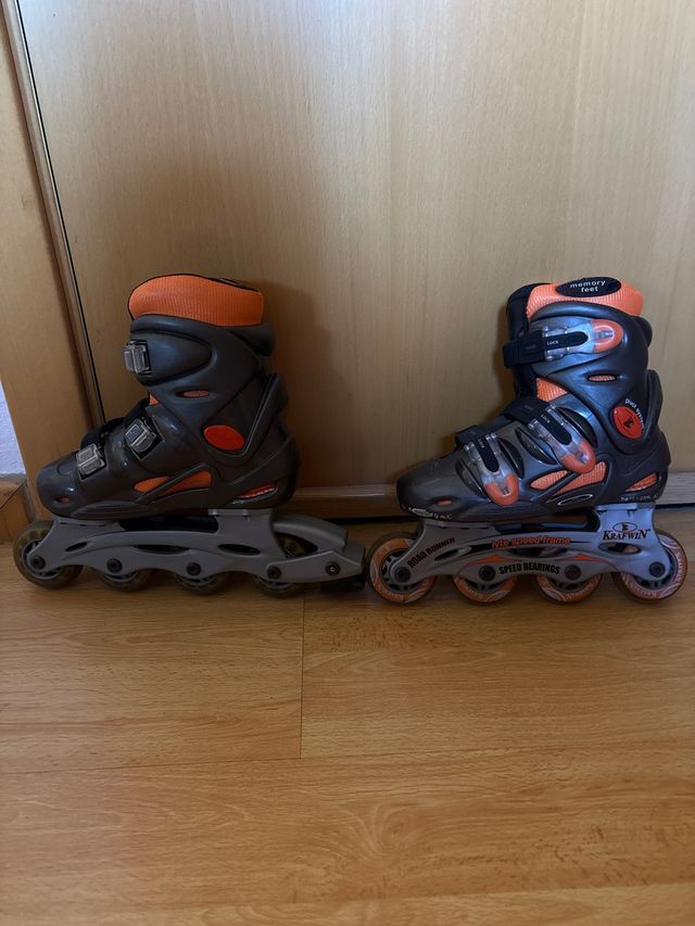 Detalles del productoPatines en línea de la marca Krafwin, con un diseño moderno en color negro y detalles en naranja.
