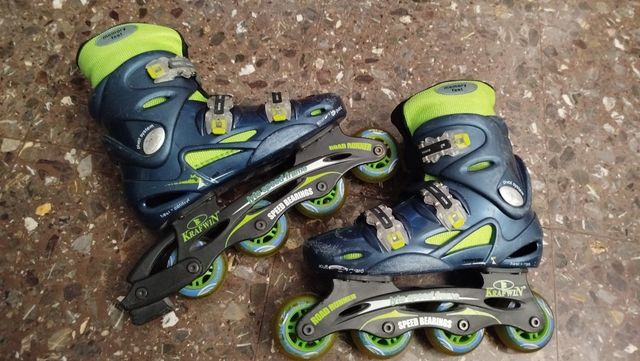 Detalles del productoPatines en línea Krafwin en color azul y verde, talla 38. Diseñados para ofrecer comodidad y rendimiento.