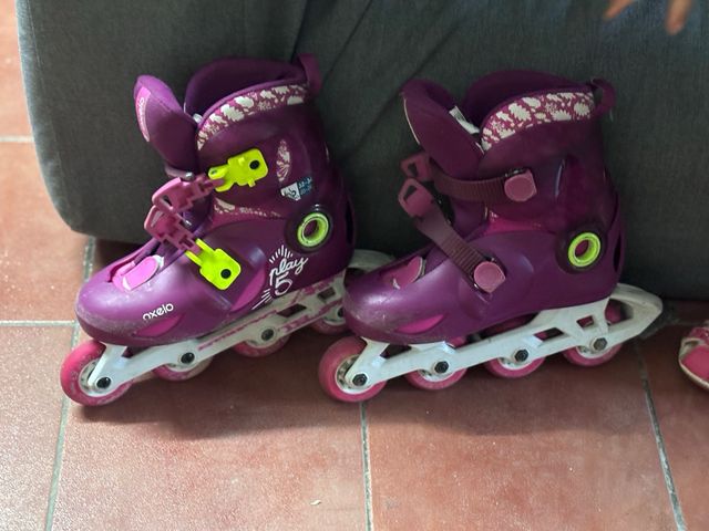 Patines en línea Oxelo Play 5 de color morado. - Talla 32-35. - Cierre con hebilla y velcro. - Ruedas de 70mm.