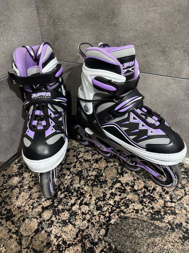 Detalles del productoPatines en línea con un diseño moderno y llamativo en color morado y negro.