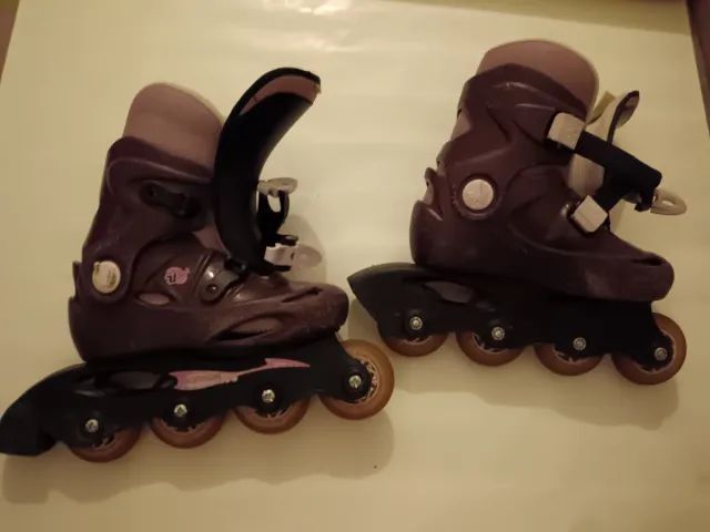 Par de patines en línea de color morado. - Cierre de velcro y hebilla. - tiene un solo freno en el patín izquierdo