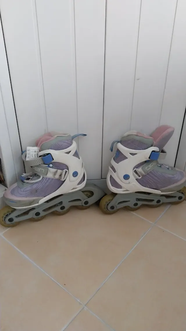 Detalles del productoSe venden patines en línea en color morado y blanco. Son cómodos y seguros para patinar.
