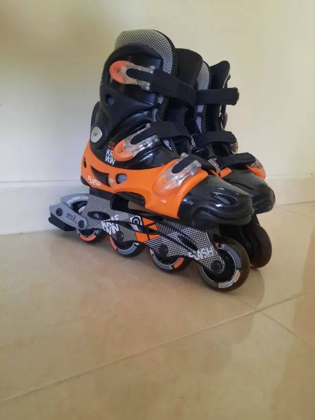 Patines en línea en excelente estado, casi nuevos. Perfectos para deslizarse con estilo. - Diseño en color naranja y negro. - Ruedas de alta calidad.