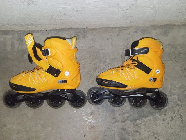 Patines en línea en perfecto estado, color amarillo brillante. Ideales para disfrutar del patinaje. - Ajuste de talla 38-41. - Cierre de velcro y cordones.