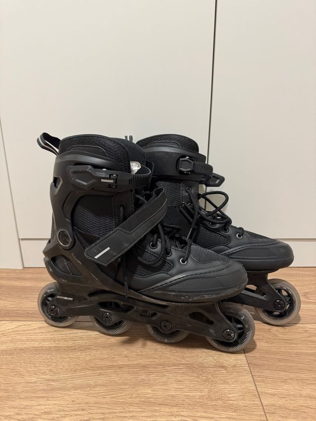 Patines en línea de color negro. Talla 42 - Cierre de velcro y hebilla. - Cordones negros. - Ruedas negras.
