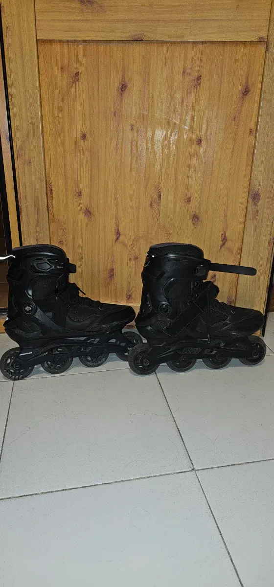 Par de patines en línea de color negro. - Diseño moderno y funcional. - Ruedas resistentes para un deslizamiento suave. - Cierre seguro para mayor estabilidad.