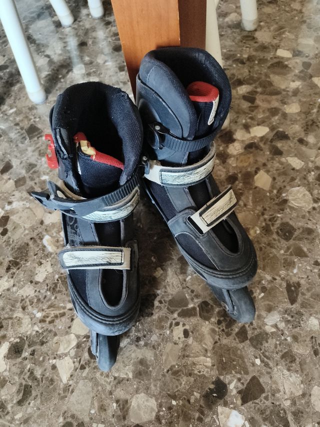 Patines en línea de color negro, perfectos para deslizarse. - Cierre con velcro y hebilla. - Ruedas de goma. - Talla 36 a 38