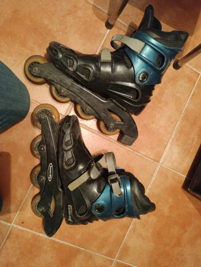 Se venden patines en línea en color negro con detalles en azul. - Cierre con velcro y hebilla. - Ruedas de poliuretano. - Diseño deportivo.