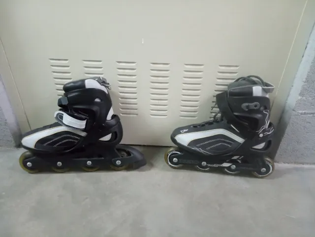 Detalles del productoPar de patines en línea en color negro y blanco. Diseñados para patinaje.