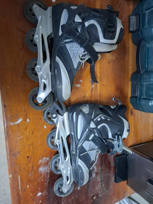 Detalles del productoPar de patines en línea con un diseño moderno en negro y detalles plateados. Son cómodos y resistentes.