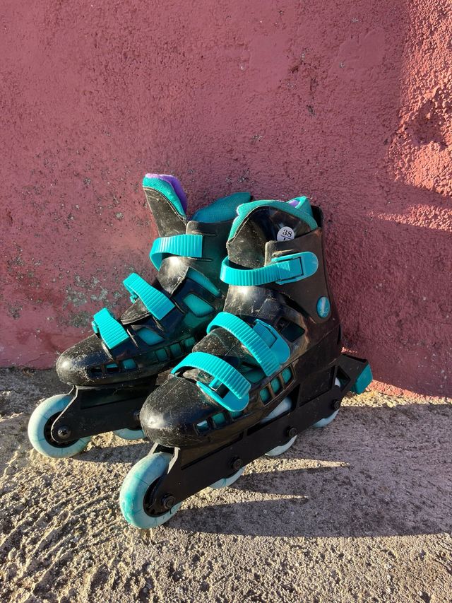 Patines en línea con un diseño llamativo en negro y detalles turquesa. - Cierre con velcro y hebilla. - Ruedas de color turquesa. - Talla 38.