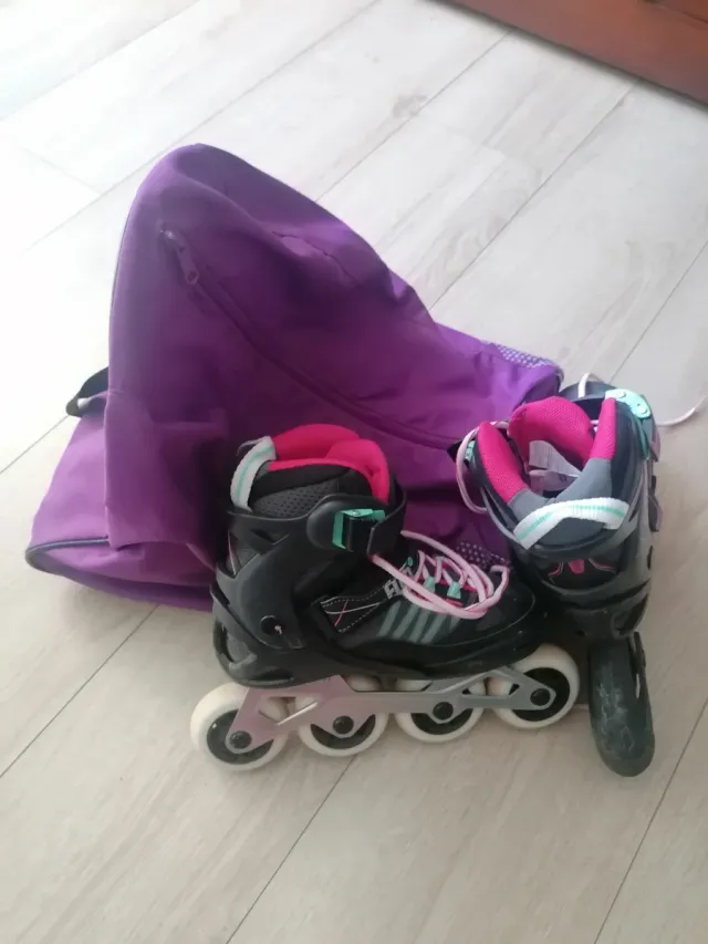 Detalles del productoSet de patines en línea para niña, con un diseño moderno y llamativo y bolsa de transporte